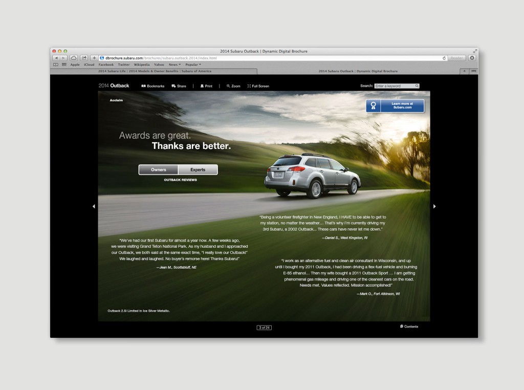 Principle developer for an AS3 digital brochure application. The application was developed from the ground up allowing for an enhanced user experience and rich digital presence. The application uses OOP methodology and is modular allowing leveraged code for new projects. Included modules for printing, zoom, share, email, thumbnail navigation, search, video player and sound as well as animation tools for content including 360s and tabbed content. Also developed all server side scripts in tandem with AS3 modules. Application was used for Nissan, Infiniti, Subaru and Audi.